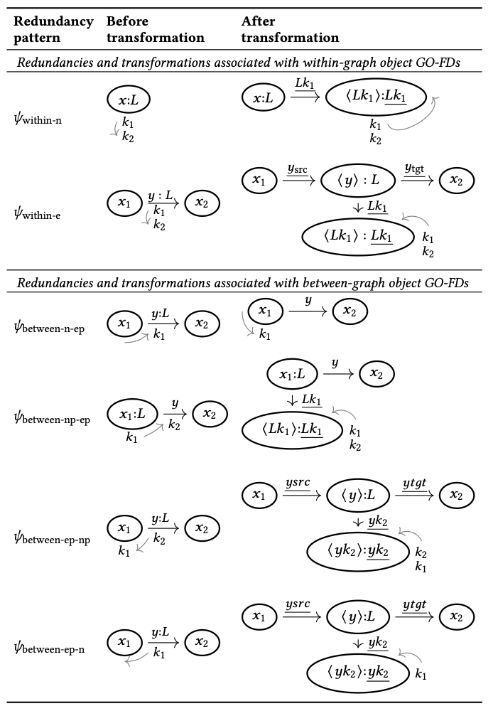 Based on redundancy patterns, i.e., the structure of the given dependencies, the transformations performed during graph-native normalization are selected from the following: